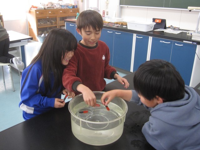2つのじしゃくを近づけたとき、ちがう極どうしは引き合い、同じきょくどうしはしりぞけ合うことがわかりました。