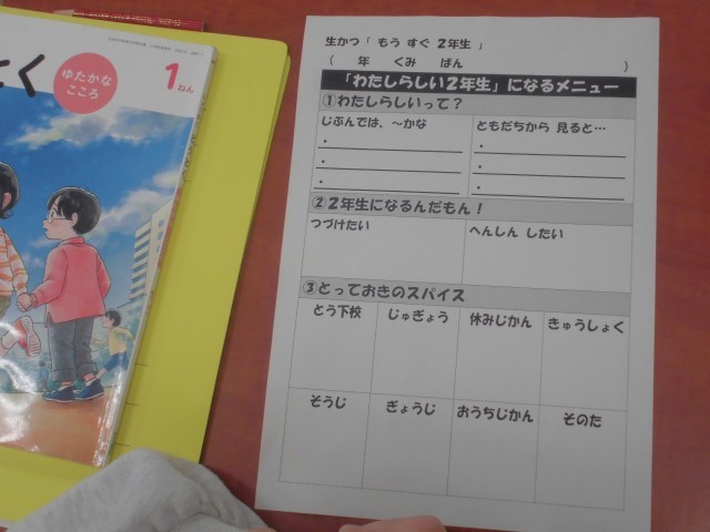 3月3日(火)1年生 生活 公開日 2026/03/04 更新日 2026/03/04 できごと 自分のよいところを、自分で考えたり、友達に聞いたりして、どんな2年生になりたいか?計画を立てていきます。 +7