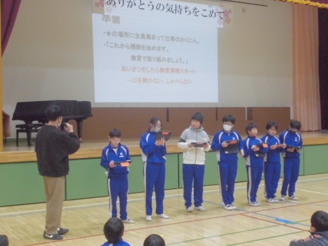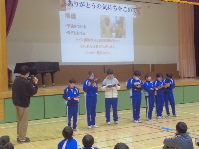 3月3日(火)掃除班編成集会 公開日 2026/03/04 更新日 2026/03/04 できごと 来年度は縦割り班で掃除をしていく計画です。この3月は、その練習のためにも縦割り班で掃除を試行していきます。6年生から、トイレ掃除の仕方など、詳しくスライドで説明してくれました。上級生の皆さん、よろしくお願いします。 +6