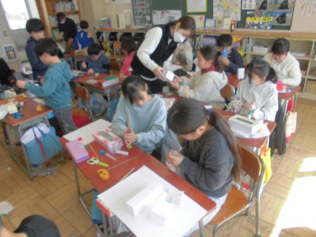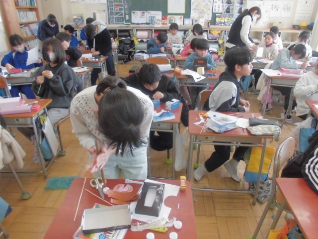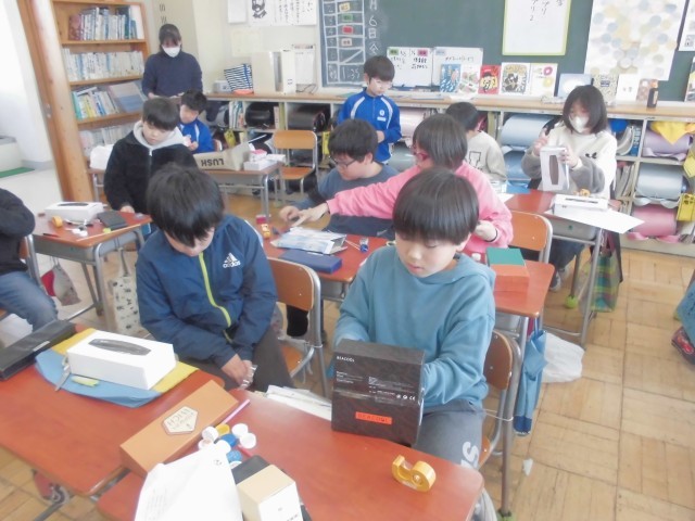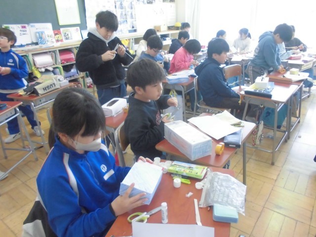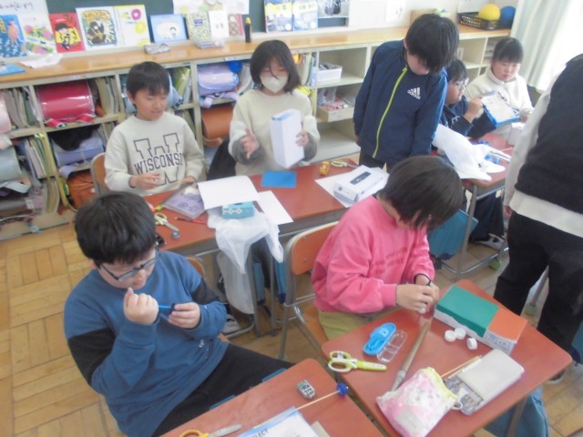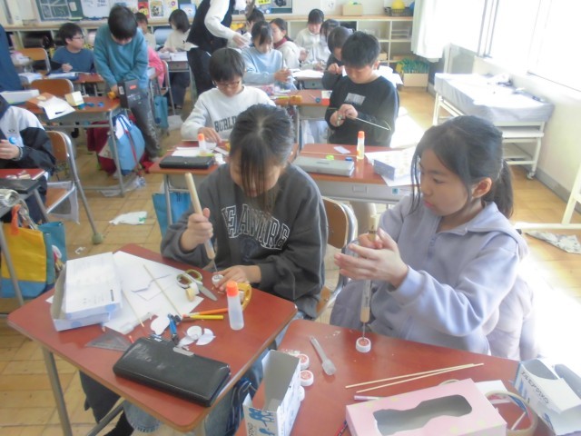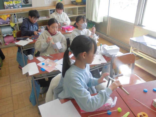 3月6日(金)4年生 図工 公開日 2026/03/06 更新日 2026/03/06 できごと ティッシュ箱などを本体として、夢の乗り物のために車輪を制作している場面でした。ペットボトルキャップの真ん中にキリで穴を開けて、竹ひごを車軸にします。 +7