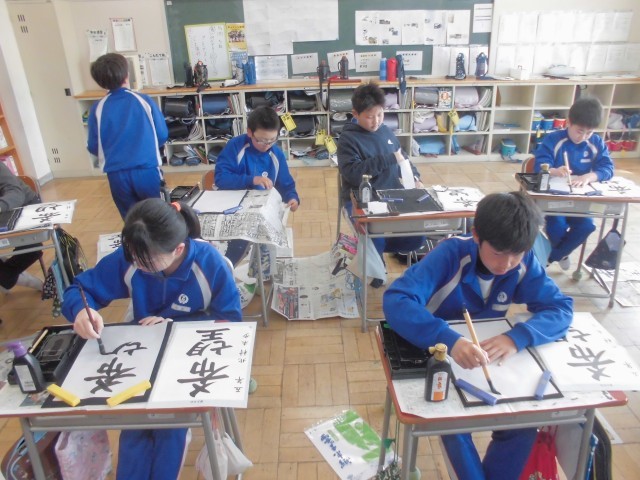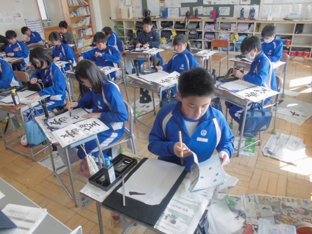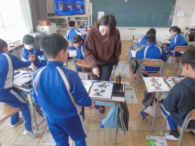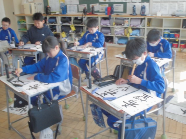 毛筆のお題は「希望」です。希望を抱き、最上級生の6年生へ!いいお題ですね。