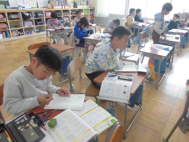 3年生の総復習問題に挑戦中です。コンパスや定規もフル活用しています。
