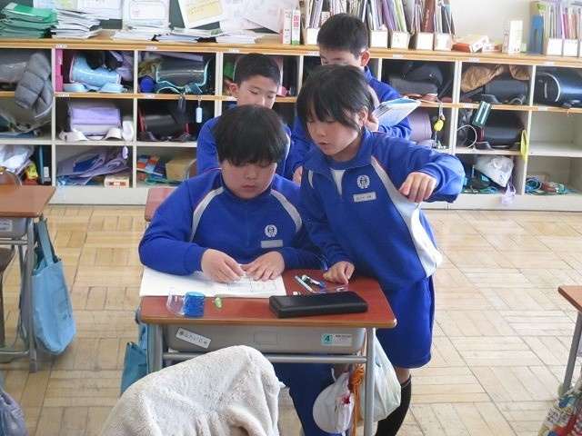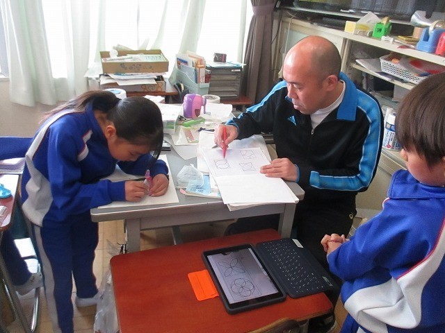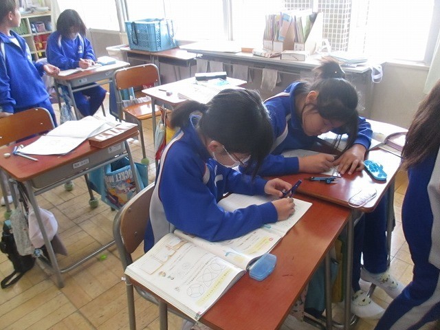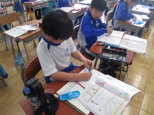 3月17日(火)3年生 算数 公開日 2026/03/17 更新日 2026/03/17 できごと 算数の学習で、教科書の例題をもとに、コンパスを使って模様を描く問題にチャレンジしました。円や半円がいろいろな向きで重なったり並んだりするので、少し難しいです。ときどき、友達同士で教え合う姿も見られます。 +1