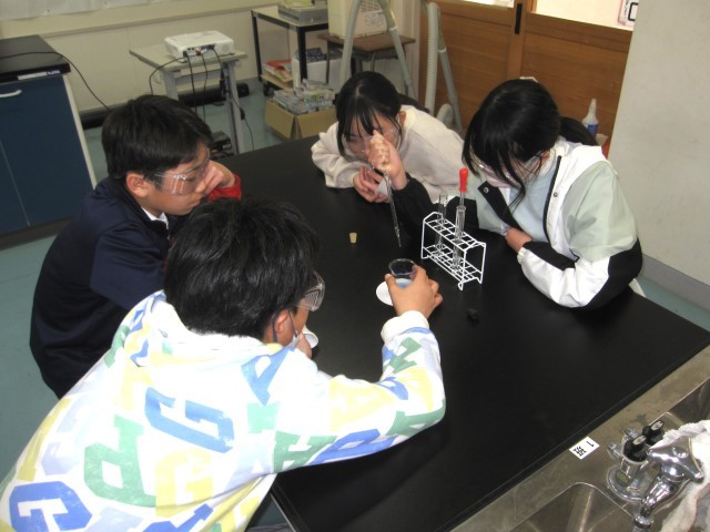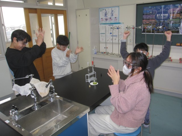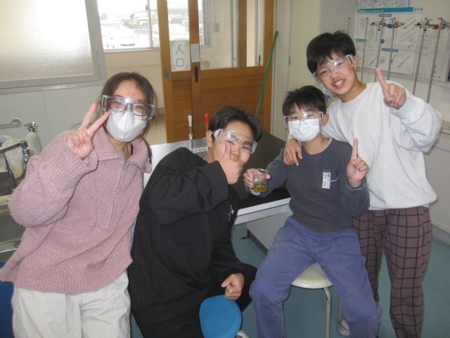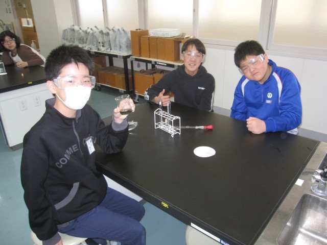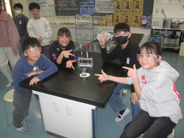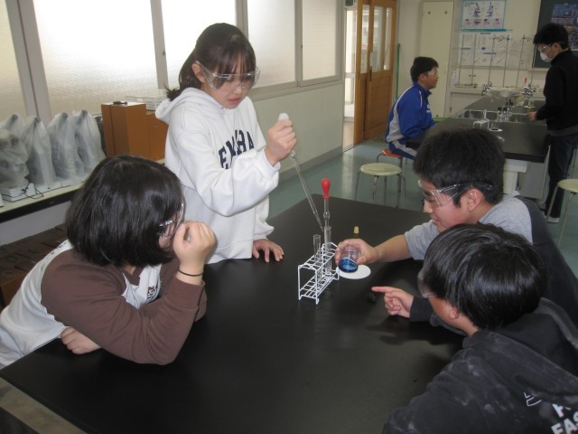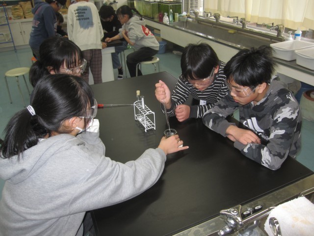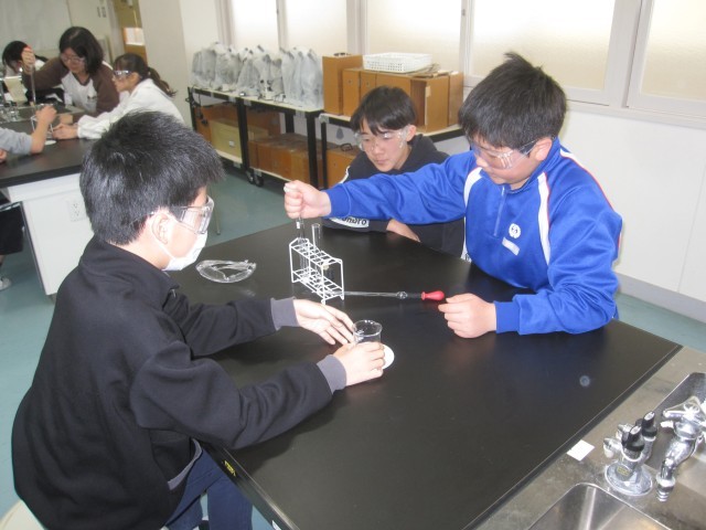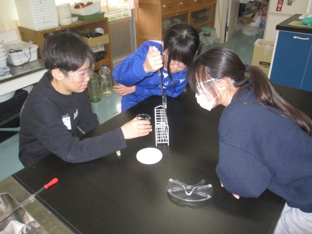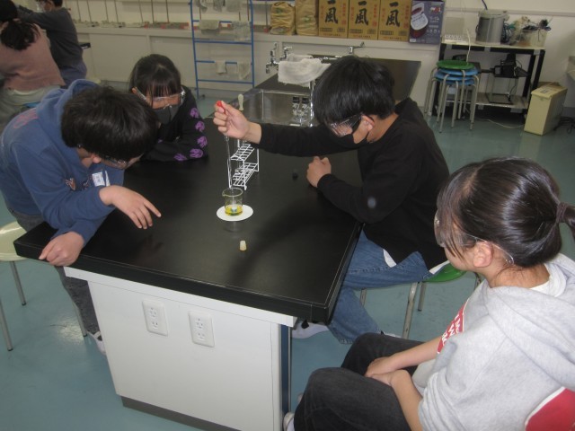 塩酸と水酸化ナトリウム水溶液の中和の実験をしました。混合液に加えたBTB液が緑色になれば中性になります。中学校で学習する内容ですが、発展的な学習として実施しました。