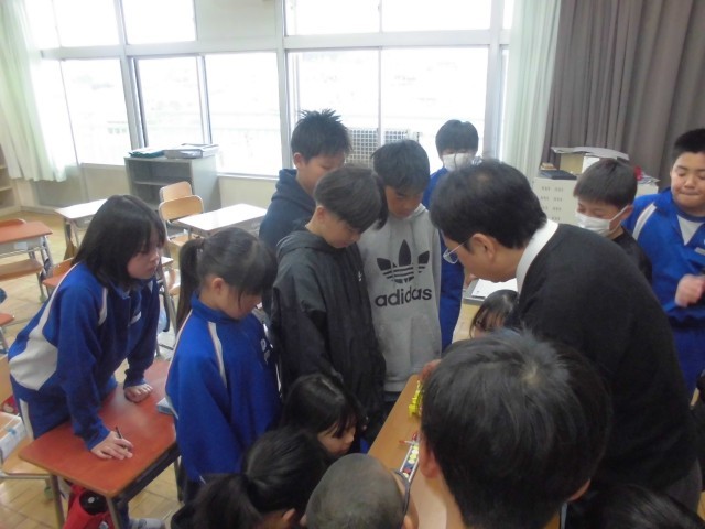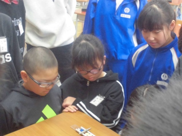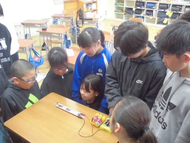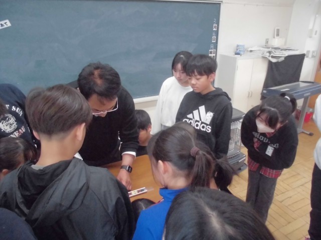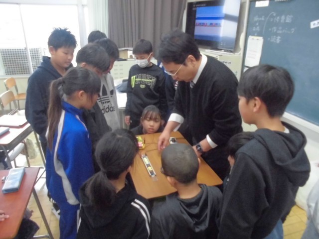 磁石を敷き詰めたアルミレールの上にアルミポールを載せ、レールに電流を流すと…ポールがコロコロと転がっていきます。電流・磁界・受ける力、フレミングの左手の法則です。もちろん中学校で学習する内容ですが、発展的に扱っています。先生手作りのキットですが、リニアモーターカーにまで興味は広がりました!