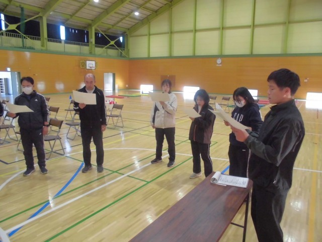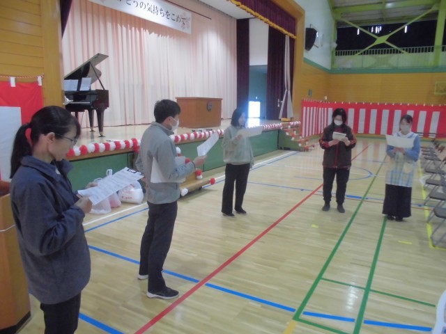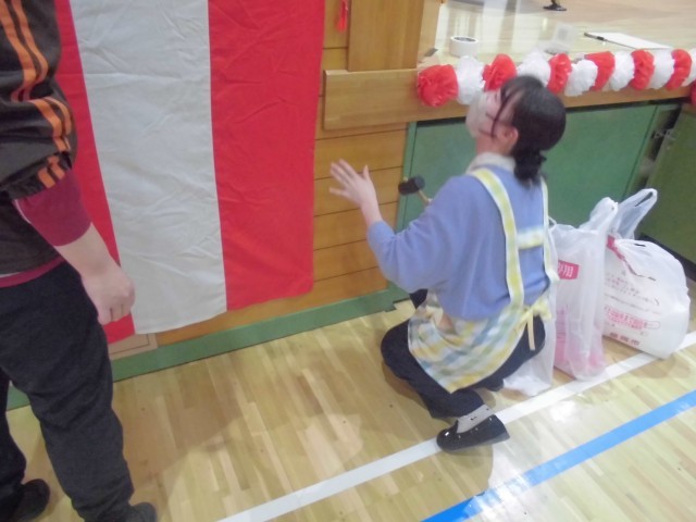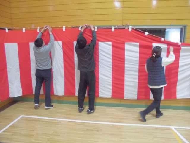 本格的な準備は月曜日に子どもたちと一緒に行いますが、教員だけができる紅白幕をまずは飾り付けました。みんなで歌う式歌「大空がむかえる朝」も練習しました。