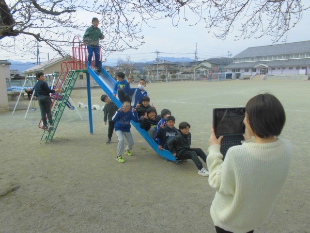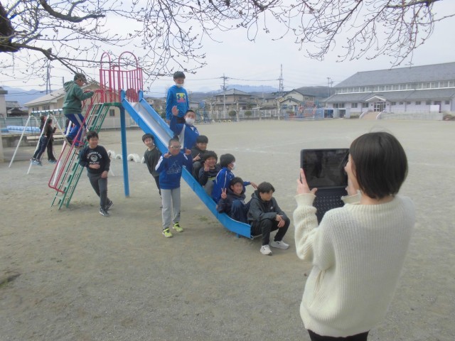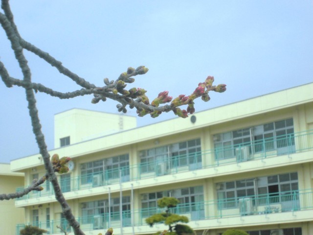 思い出づくりのために、みんなで記念撮影です。校庭のサクラももう少しな感じです。