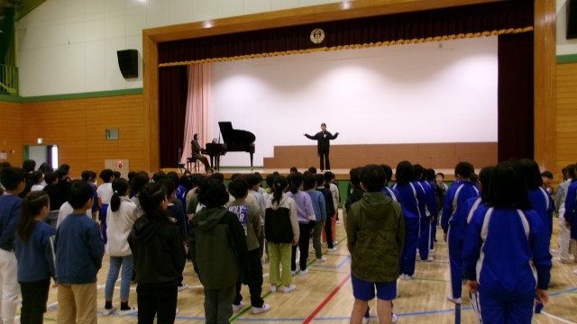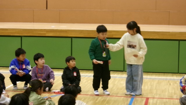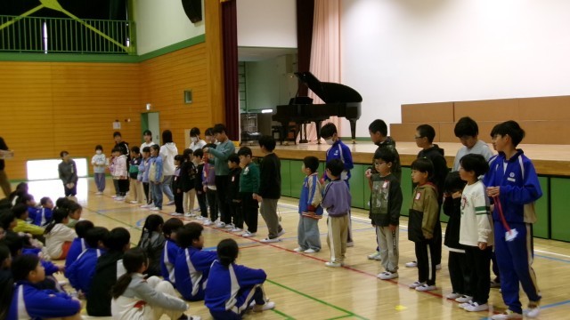 今日の業前は、新一年生を迎える会を、児童会本部役員が中心となって開催しました。6年生と手をつないで入場してきた1年生は、入学式と比べてちょっぴりたくましく見えました。6年生に手を引かれてとてもうれしそうでもありました。首飾りやアサガオの種のプレゼントをもらったのちに、1年生の名前をみんなで早く覚えられるよう、1年生が一人一人自己紹介をしました。最後はみんなで校歌を合唱して会を終えました。2年生から6年生までの子どもたちのあたたかさと、1年生のちょっぴりりりしい姿が心に残る会でした。これからの子どもたちの活躍がとても楽しみです。
