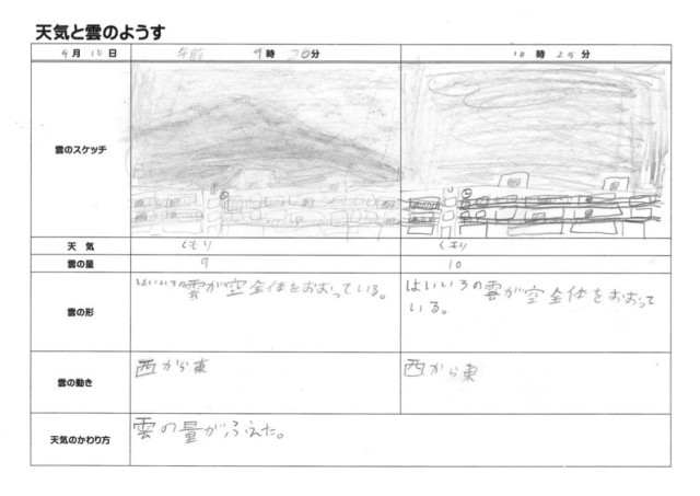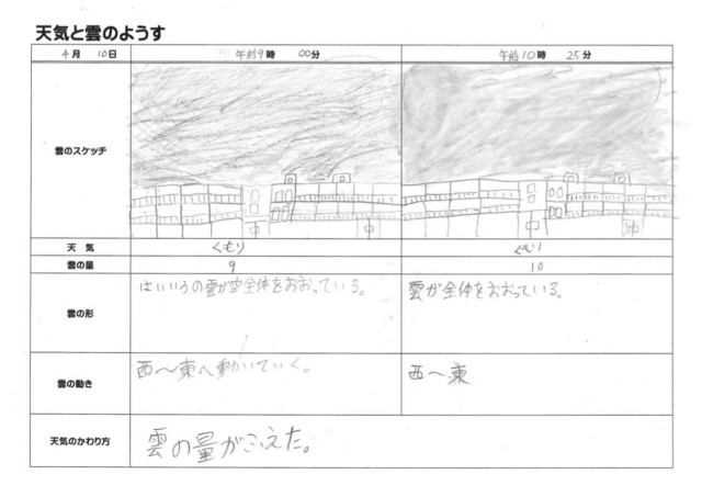 4月10日(金)5年生 理科 その2 公開日 2026/04/10 更新日 2026/04/10 できごと 天気の変化には、雲の量や動きが関係していて、雲の量がふえたり減ったりすると天気が変化することがわかりました。 +1