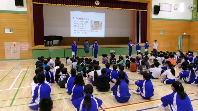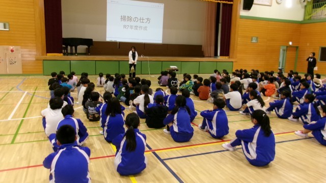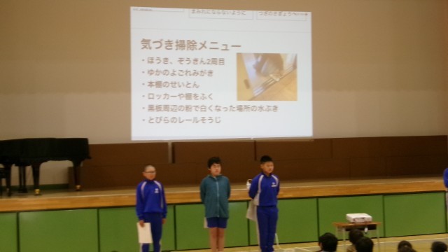 今日の業前は清掃集会です。今日から本格的に清掃活動が始まります。児童会の子を中心に、どの場所でどのように掃除をするのかの発表がありました。平井小学校では、縦割り活動での清掃が基本で、無言清掃を行っています。きれいな場所で気持ちよく生活するためにも清掃をがんばります。