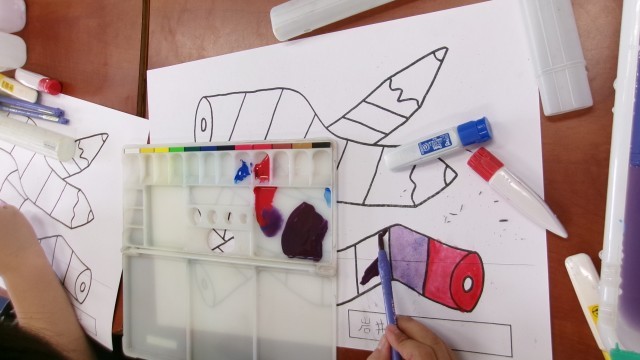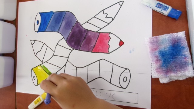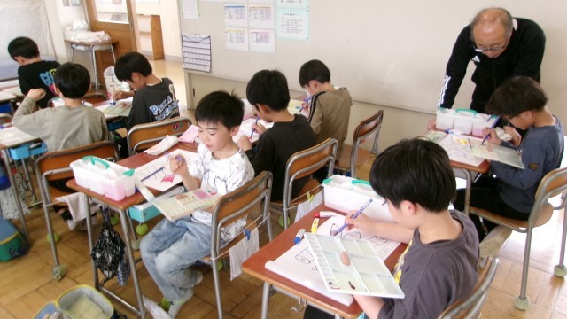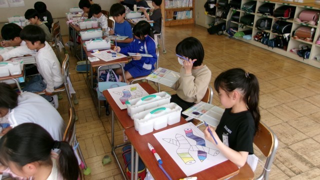 4年生は、水彩絵の具のうち色の3原色(赤・青・黄)を混ぜ合わせて色を作りながら、色彩の美しさを実感する学習をしていました。3原色のうち2種類の組み合わせで作った色を友だちと比較しながら、「おれと同じ混ぜ合わせ方なのに色が違う」とか「すごくきれいな色になってる。いいなあ。」など子どもたちはいろいろな実感を持ちながら色作りや色塗りを進めていました。