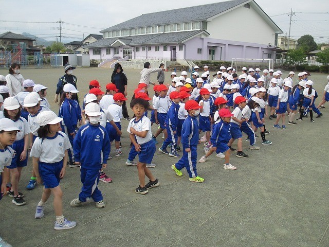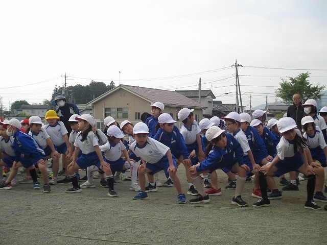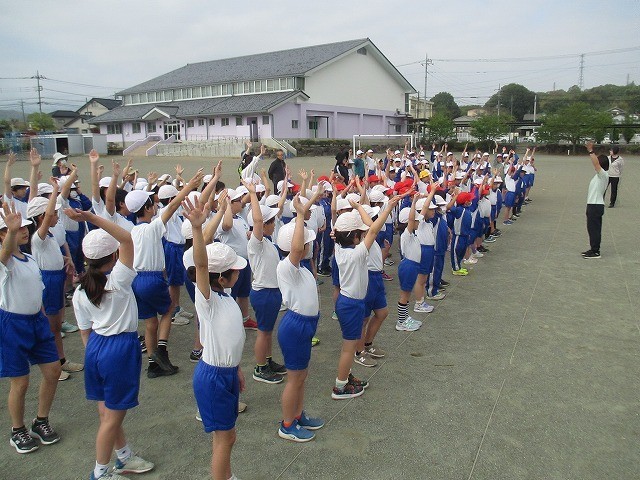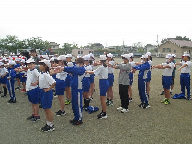 4月17日(金)体育集会 公開日 2026/04/17 更新日 2026/04/17 できごと 整列の仕方、方向転換、体ほぐしの運動をしました。集団行動の意味を知るだけではなく、自分のボディーイメージを掴むことができます。友だちと列をそろえるには、どの位置でそろえるといいかな?回れ右は、体をどの順番で動かすと、素早く回れるかな?右肩、左脚など、先生の指示を聞きながらすぐに触れるかな?おうちでも、ゲームみたいにして楽しくやってみてくださいね。 +2