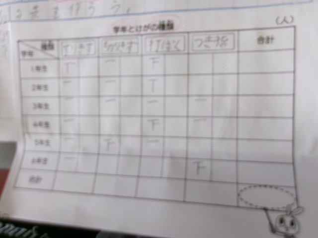 4年生は算数で、数を、表やグラフで表す学習に取り組んでいます。けがをした人の数を確かめるのに、まずは種類別に何人いたかを「正」の字を使って数えていきます。性の字を使って数を確かめる方法は子どもたちにとっては物珍しかったようで、楽しんで取り組んでいました。