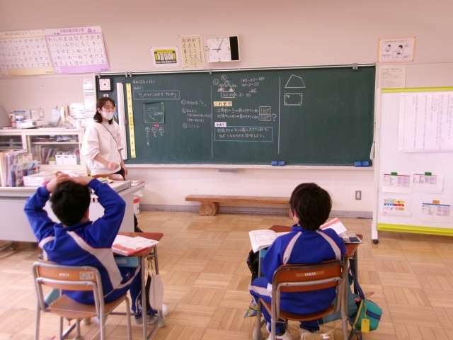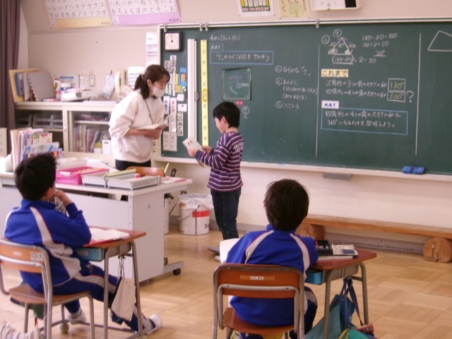 ひまわり学級では1年生が国語、5年生が算数の学習をしていました。1年生の国語は音読です。先生やみんなの前で照れながらも上手に音読できたので先生からほめられてうれしそうでした。5年生は算数、「どうして四角形の角の和は360度になるのか」という問いに、いっしょうけんめい考えていました。2人とも「先生ヒントちょうだい」とお願いしています。どうやら「どうしてそうなるのか」という問いが心をくすぐったようで、なんとか説明しようとがんばっていました。