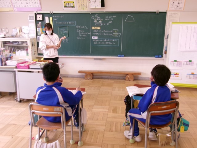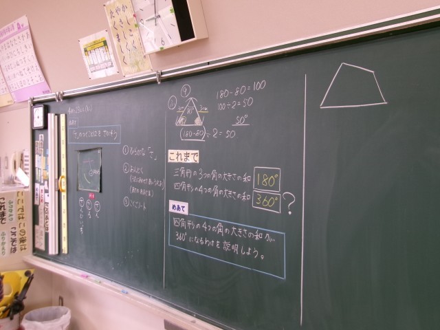 先生からは「この間、長方形の角の和は360度になることを○○さん上手に説明していたよね」というヒントが出されていました。このことを元に学習を進めていきます。