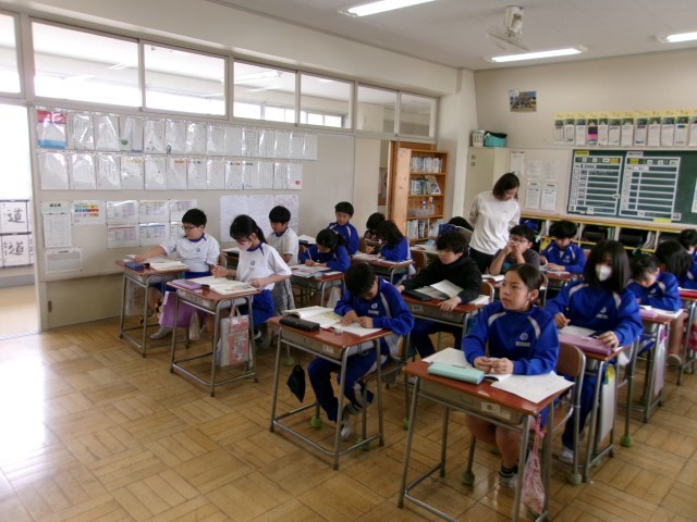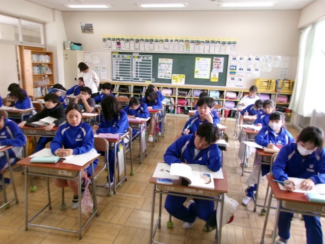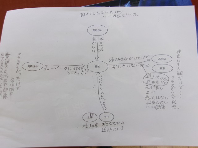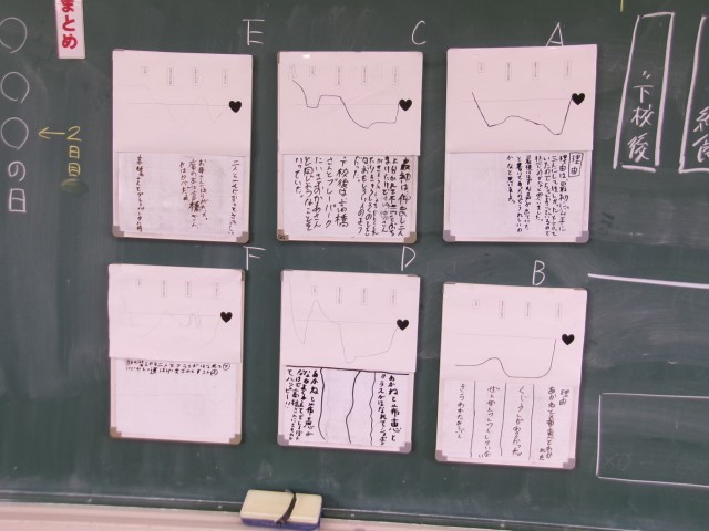 五年生の国語は昨日に引き続き、物語文の読解です。特に主人公の様々な人との関わりを通して心情の変化を読み取っていきます。今日は主人公の心情の変化をこれまでの学習を元に、折れ線グラフで表していました。子どもによってとらえ方の違いもあり、いろいろな友だちの考えを子どもたちは聞き、考えていました。最後に主人公の気持ちになって日記を書いてみる学習をしました。心情を目で見えるように表しているところが面白いなと思いました。