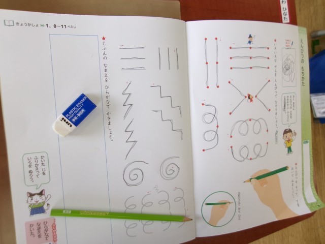 1年生は書写の学習でえんぴつの持ち方から学習しています。今日は線やぐるぐるを書いたりながら正しい持ち方を学んでいました。