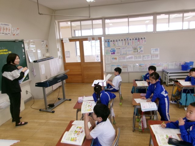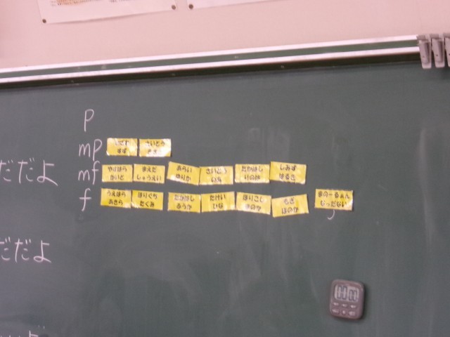 2年生は音楽で「かくれんぼ」の歌唱を学習しています。今日はかけ声の所(「もういいかい」「まだだよ」)のところをどんな風に歌ったらよいか考えていました。考える目安として先生からP(ピアノ)、mp(メゾピアノ)、mf(メゾフォルテ)、f(フォルテ)の中で、どれを選んで歌ったらよいかとの問いかけがありました。子どもたちは自分の考えでそれぞれよいと思うものを選んでいました。mpを選んだ子どもの意見を聞いてみると「かくれんぼだからばれないように優しく言うのがいい」ということでした。子どもたちは自分なりによく考えていることが分かりました。この後、実際に歌ってみてどれが合うかをまた考えていきます。
