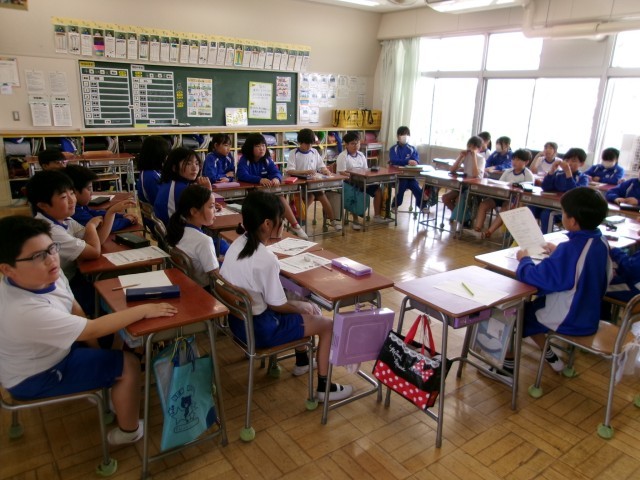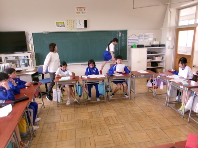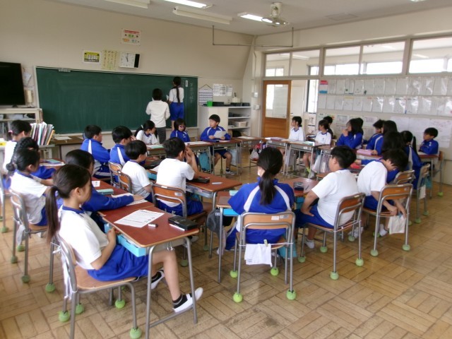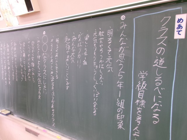 5年生は学級の目標について話し合っていました。座席も話し合いの形態になり、司会団をもうけての学級会です。話し合い活動が学習の大切な要素となる中、学級会も大切な学習の一つです。子どもたちの意見から、「このクラスのよいところ」「特徴」「こんなクラスにしたい」などの順で、活発に意見が出されました。先生から、「発表してくれた人には拍手がいいね」というアドバイスを受けながら、子どもたちが自主的に話し合い活動を進めていきます。最後まで授業は参観できなかったのですが、あとでどんな目標になったかを聞きたいと思います。