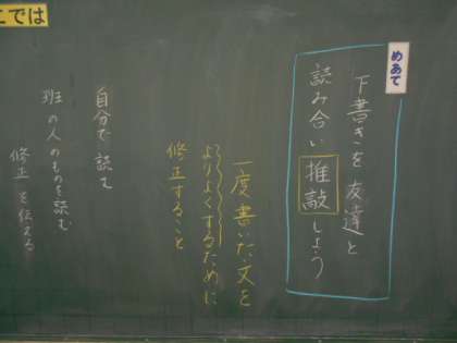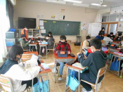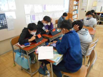 12/20 6年生国語 公開日 2022/12/20 更新日 2022/12/20 できごと 今日の6年生は、文章を推敲してみようというねらいで授業が進みました。それぞれがタブレットPCで書きためた文章をグループで共有し、書き加えたり、アドバイスをしたりしていました。話し合いにタブレットPCが入ると内容がグッと深みが増す、そんな授業でした。