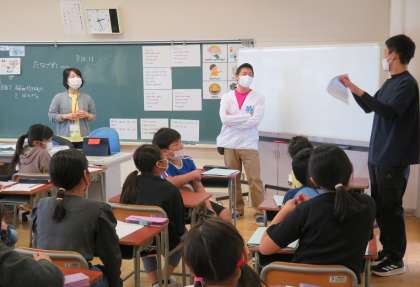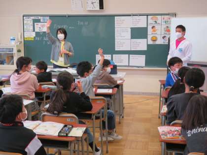 4/18 英語の授業 公開日 2023/04/18 更新日 2023/04/18 できごと 5,6年生の英語は、ALTのブラント先生、西中英語担当の棚澤先生に教えていただきます。本日が初めての英語の授業でした。リズムに乗ってとても楽しそうでした。あっという間の1時間でした。