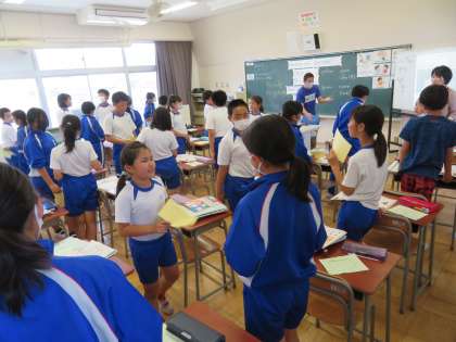 5/16 英語の授業 公開日 2023/05/16 更新日 2023/05/16 できごと 5年生、6年生の英語は、西中学校の英語担当の棚澤先生、ALTのブラント先生の授業でした。 5年生は、「What 〜 do you like ?」「I like 〜 .」の表現を使って、会話を楽しそうにしていました。(写真上、中) 6年生は、「I like 〜 .」の表現を使って、プロフィールカードを作っていました。(写真下)