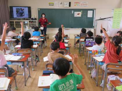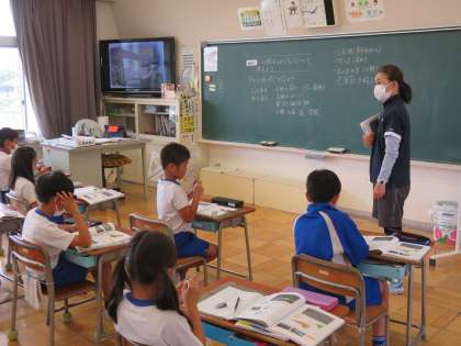 2年生は、国語「かんさつ名人になろう」で、なすの写真を見て、色、形、大きさなど、
