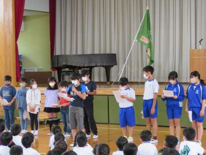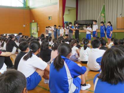 6/6 緑の少年団結団式 公開日 2023/06/06 更新日 2023/06/06 できごと 今日の業前活動は、緑の少年団の結団式を行いました。 環境整美委員会が中心となり、進行してくれました。 団長の齋藤くんから「平井小のみんなで花や緑を大切にしていきましょう」とあいさつがありました。 花や緑を大切にする活動を通して、友だちや平井小、地域のことを大切にする心を育てたいと思います。