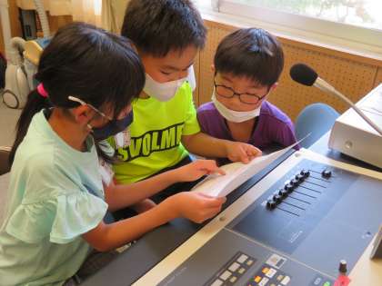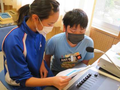 保健委員会のメンバーがお昼の放送を使って、クイズを通して「歯を大切にしよう」と呼びかけています。