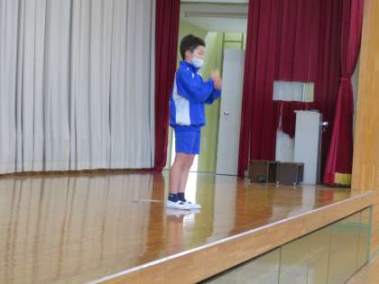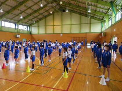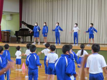 6年生の有志が手本となって全校で歌ったり踊ったりしました。