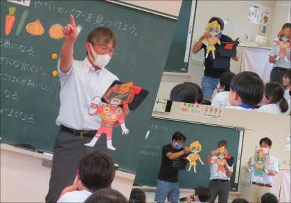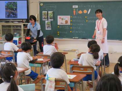 2年生は、栄養教諭の高橋先生を招き、野菜の特徴やはたらきについて学習しました。