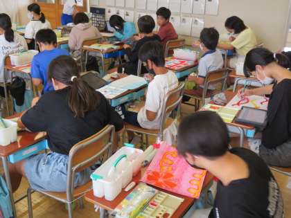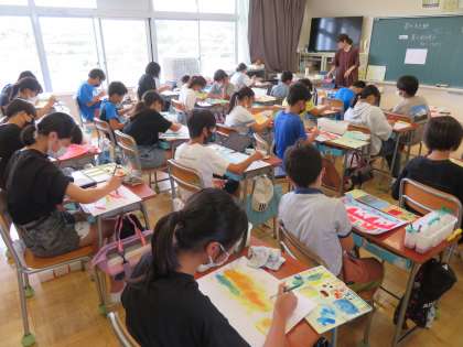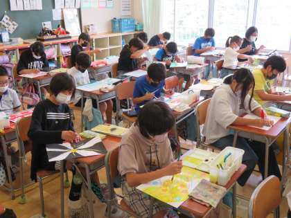 6年生は「音を形や色でイメージしよう」というめあてで水彩画に取り組んでいました。