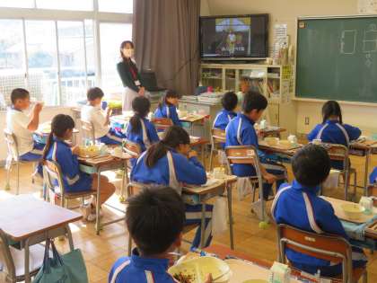 3年生は、給食の時間に、給食センター栄養士の飯島さんに食育に関するお話をしていただきました。