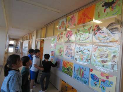 3年生は、図工「めんぼうアート」で仕上げた作品の鑑賞をしていました。自分の作品の工夫したところ、友だちの作品のよいところなど、じっくり作品を見つめていました。(写真上)