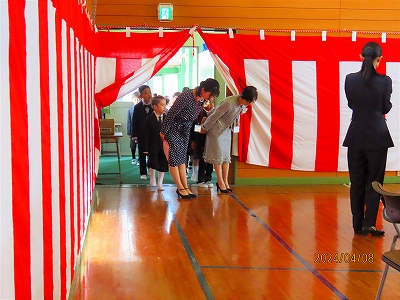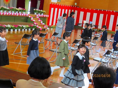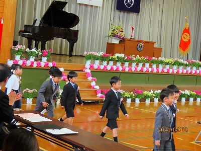 2クラスのスタートです。2人の担任の先生を先頭に入場です。