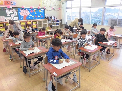 歌に合わせて、ひらがなの「あいうえお」を書く練習です。