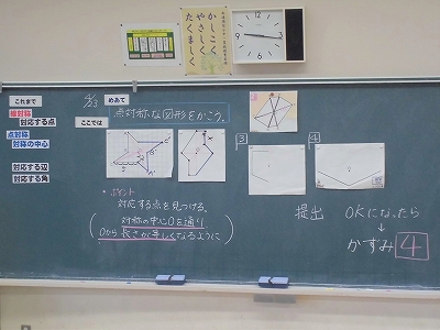 定規、コンパスを駆使して、線対称の図形をノートに書き写します。