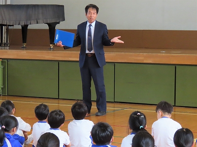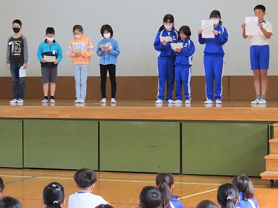 朝の集会で、担当、校長、児童会よりスローガン等を発表しました。