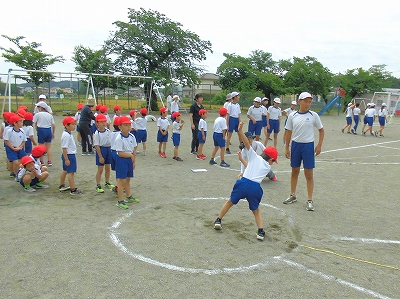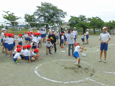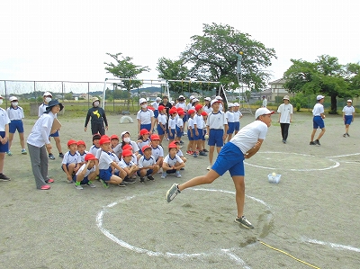 6年生がボール投げのお手伝いです。お手本もバッチリです!