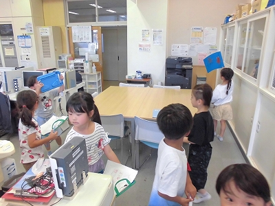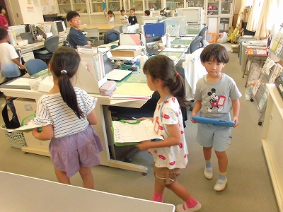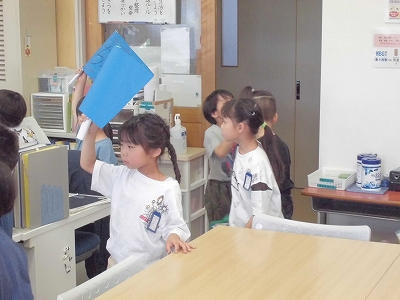 学校探検に回ります。旗を持って、職員室を訪れた1年生たちです。