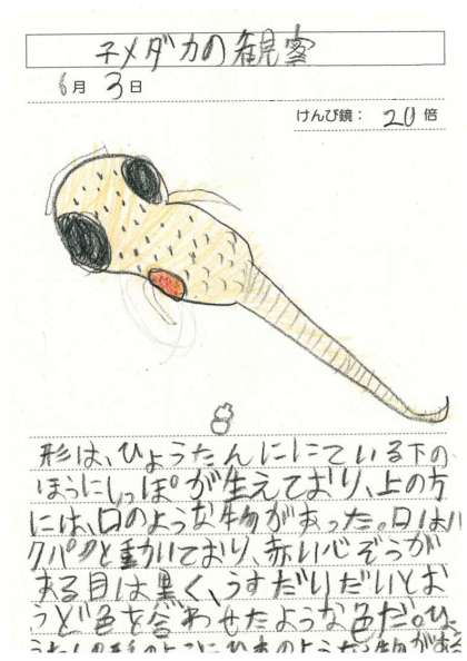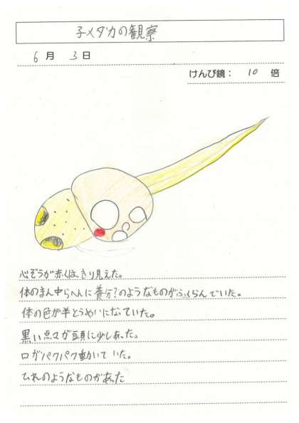 6月3日(月)5年生 理科 その4 公開日 2024/06/03 更新日 2024/06/03 できごと 赤く見えるのは心臓です。人と同じで左側にあります。いちばん下の記録カードは、腹側から見たスケッチです。