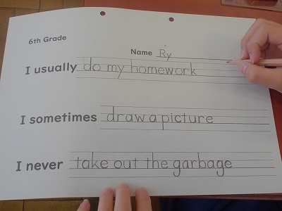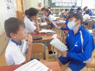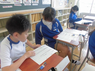 こんなにきれいにワークシートを仕上げて、英語で交流します。