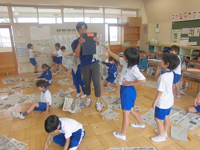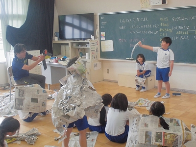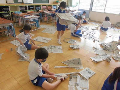 新聞紙をつかって、好きなものを制作しました。発表会も行いました。