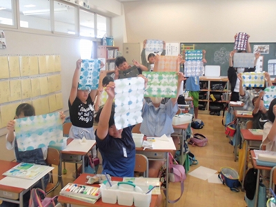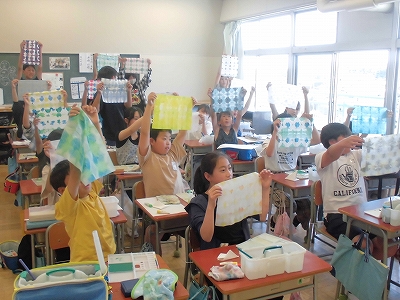 和紙を折って絵の具を染みこませ、開いた時の模様を楽しみます。