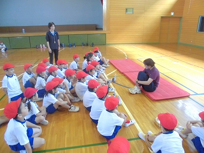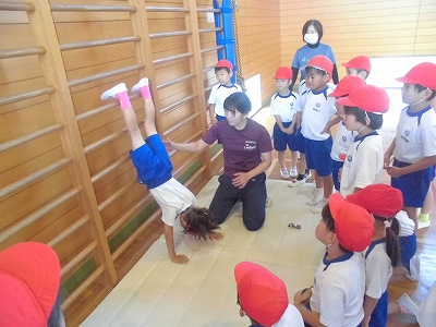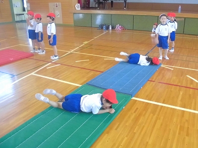 マット運動です。楽しみながら、いろいろな種目を頑張ります。