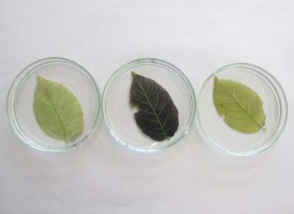 6月7日(金)6年生 理科 その4 公開日 2024/06/07 更新日 2024/06/07 できごと 朝葉にでんぷんがないのを確かめた葉(左)、数時間日光を当てた葉(まん中)、日光を当てなかった葉(右)