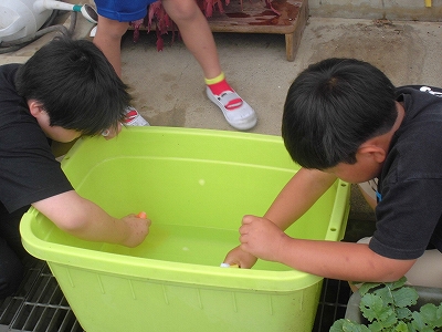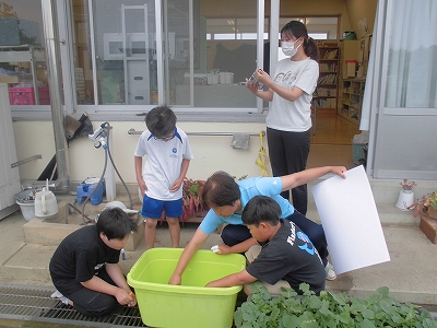 大きな入れ物で模様をつくり、大きな画用紙に写し取りました。