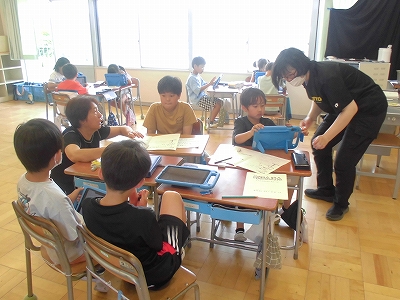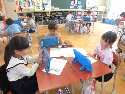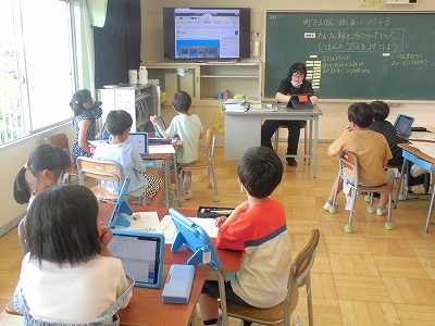 町たんけんで訪問する場所を、タブレットで検索して調べておきます。
