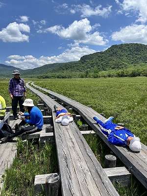 人の少ない尾瀬は珍しく、食後に木道に寝そべる贅沢を味わいます。