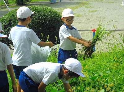 交流学級の総合の時間です。この時期の大敵、雑草の草むしりです。
